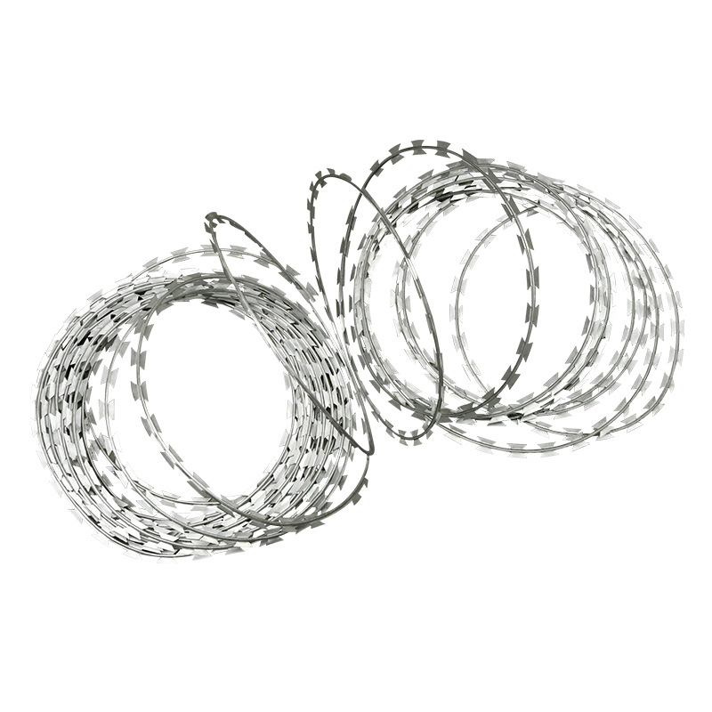 刀片刺繩(razor barbed wire),又稱為刀片刺絲或刀片刺網,是一種近年來廣泛應用于各類安全防護領域的新型高強度防護材料。它由高強度金屬帶材沖壓成鋒利的鋸齒狀刀片,并通過高張力鋼絲串聯(lián)而成,形成一種具有強烈威懾力和高效阻隔功能的防護結構。與傳統(tǒng)鐵絲網相比,刀片刺繩不僅在物理防御性能上更為優(yōu)越,而且在外形設計上也更加美觀大方,因此被越來越多地應用在各種安全要求較高的場所。